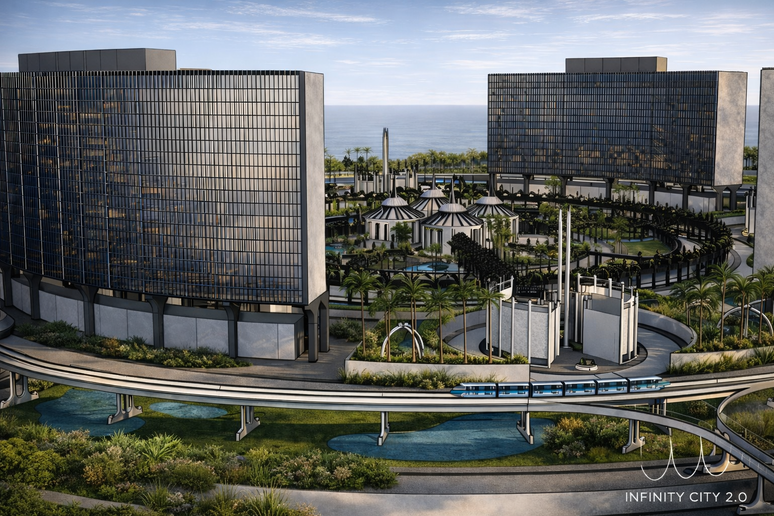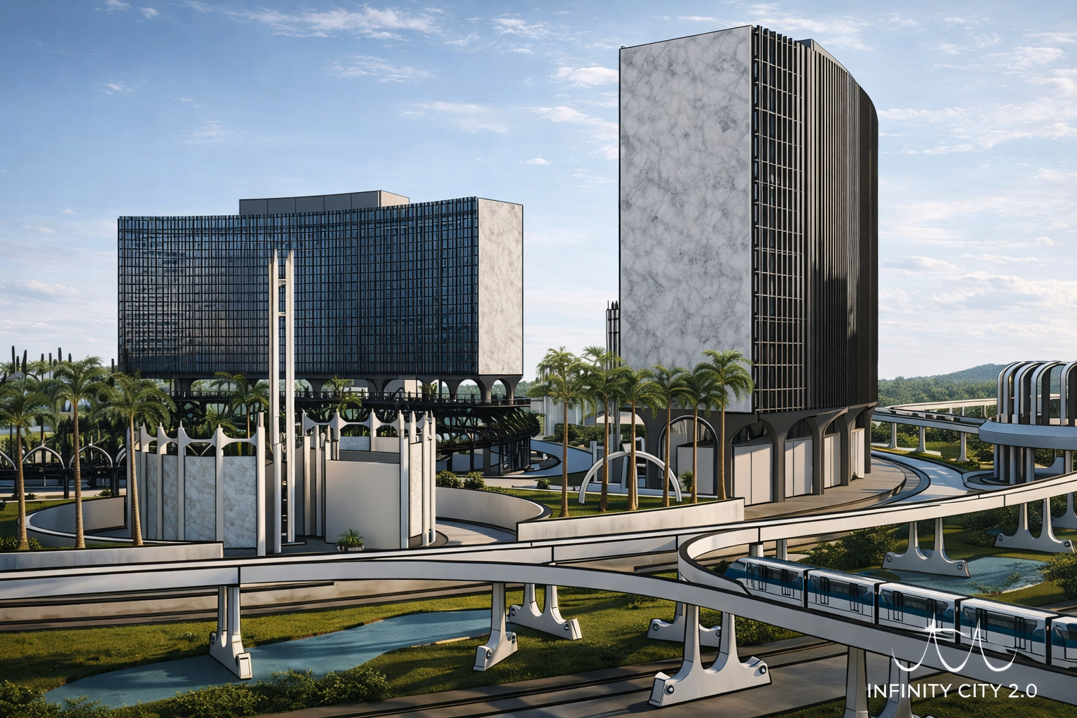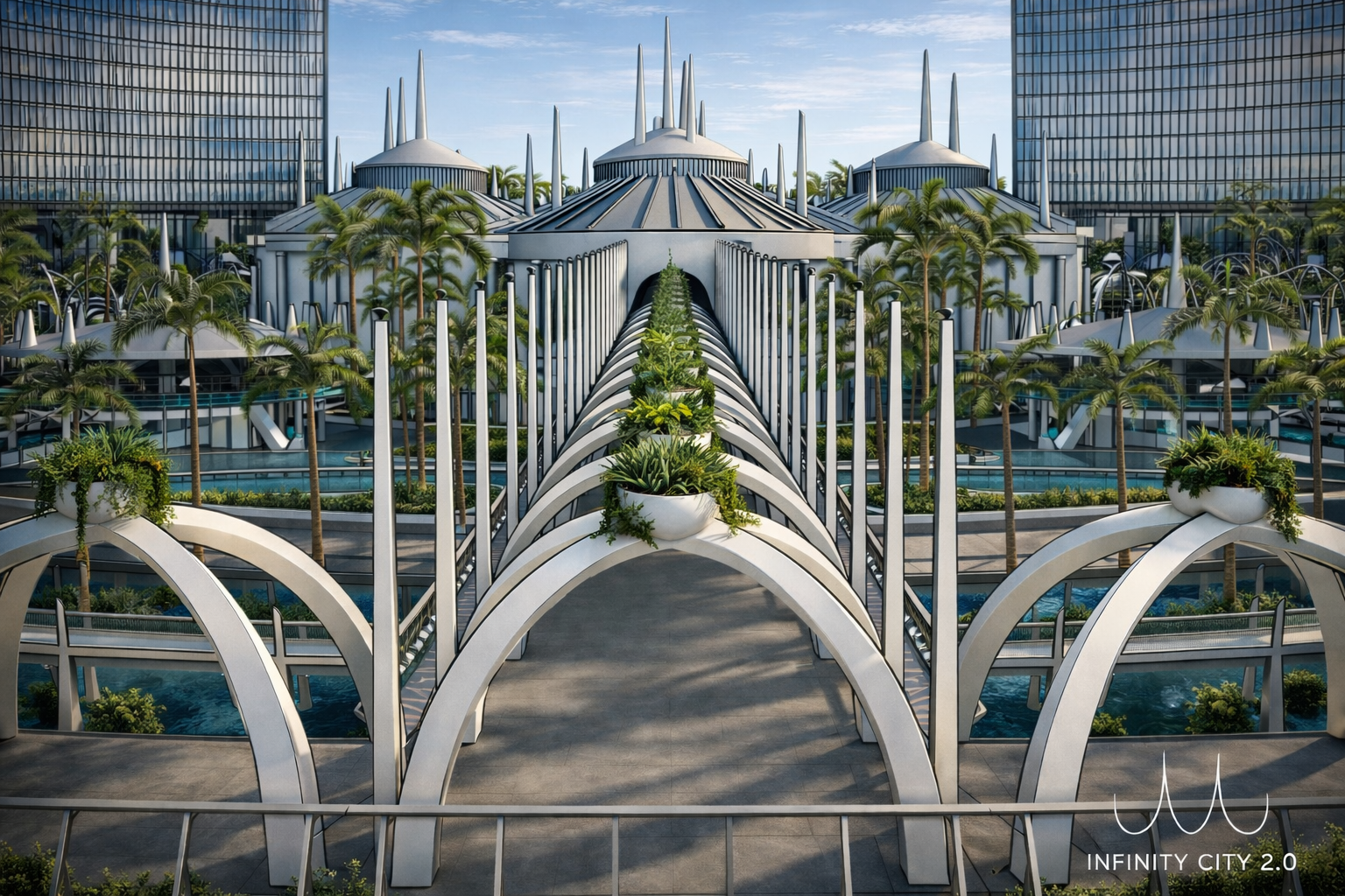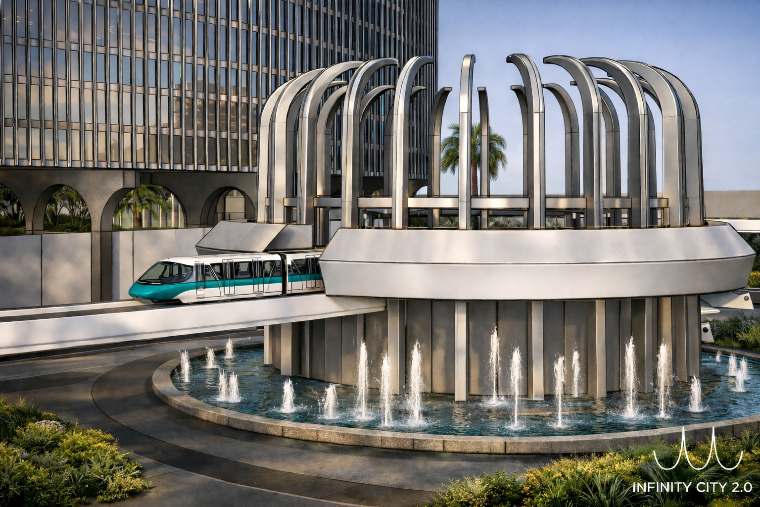 Infinity City, conceived in the mid-21st century and inspired by the optimism and innovation of retro-futurism, is an urban design that pushes the boundaries of what cities could be. At its core, Infinity City is built upon the idea of providing equal opportunities and possibilities to every citizen, creating a city where boundaries—whether physical, social, or economic—are eliminated, and all people have access to the same opportunities, experiences, and resources.